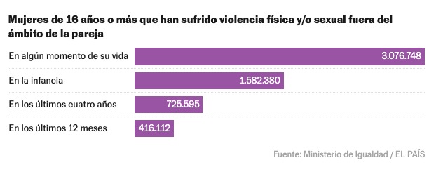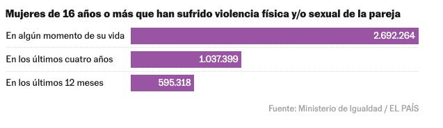 Casi una de cada tres mujeres en España (30,3%) de 16 años o más años ha sufrido algún tipo de violencia por parte de su pareja actual o de exparejas en algún momento de sus vidas. Ese algún tipo de violencia se refiere a agresiones físicas, violencia sexual, restricciones económicas o ataques psicológicos. Son 6.445.301 mujeres, según la Macroencuesta de Violencia contra la Mujer 2024, publicada este miércoles por el Ministerio de Igualdad, una ambiciosa radiografía que analiza cada cinco años el impacto y la evolución de la violencia machista en sus distintas manifestaciones. De ellas, el 12,7% asegura haber sufrido violencia física o sexual dentro de la pareja en algún momento de su vida, lo que se traduce en 2.692.564 mujeres. Fuera del ámbito de la pareja, un 14,5% indica haber sufrido violencia sexual en algún momento de su vida (3.076.748 mujeres). Esta violencia ha dejado secuelas de salud física o psicológica en 1,6 millones de mujeres.