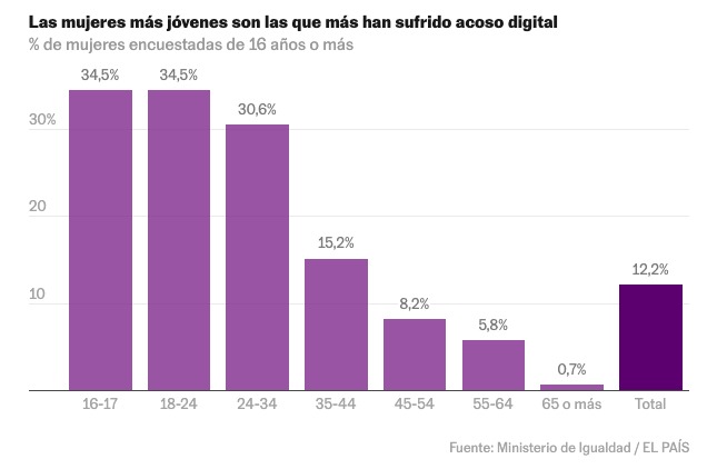 Según Igualdad, este año fueron incluidas nuevas preguntas para medir con mayor rigor la violencia y el acoso facilitado por la tecnología. Los resultados apuntan que el 2,6 millones de mujeres han sufrido acoso digital (con o sin connotaciones sexuales) en algún momento de sus vidas, especialmente las más jóvenes. Declaran haberlo vivido el 34,5% de las mujeres de entre 18 y 24 años y el 28% de las adolescentes entre 16 y 18 años.
