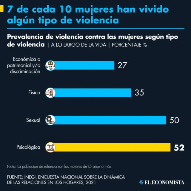 Particularmente en México, 7 de cada 10 mujeres han vivido al menos un tipo de violencia a lo largo de su vida. Siendo la psicológica la de mayor prevalencia, debido a que impacta directamente en el desempeño de las mujeres en todos los ámbitos de su vida.