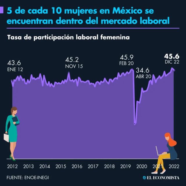 La mitad de las mujeres en México forman parte de la fuerza laboral. Al corte del cuatro trimestre del 2022 se registró una tasa de participación femenina de 45.6%, de acuerdo con cifras de la ENOE (Encuesta Nacional de Ocupación y Empleo) del Inegi.