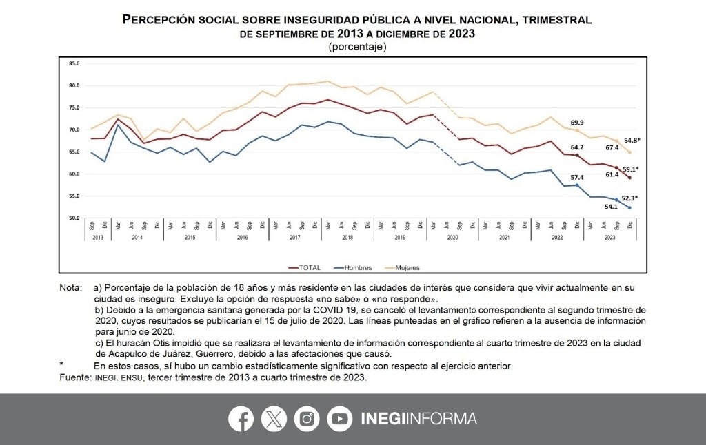 A nivel nacional, el 59.1 por ciento de la población de 18 años y más, residente en 75 ciudades de interés en México, consideró que es inseguro vivir en su ciudad, la proporción más baja desde que el Inegi levanta la Encuesta, en septiembre de 2013, cuyo objetivo del censo es generar estimaciones sobre la percepción de la población sobre la seguridad pública.