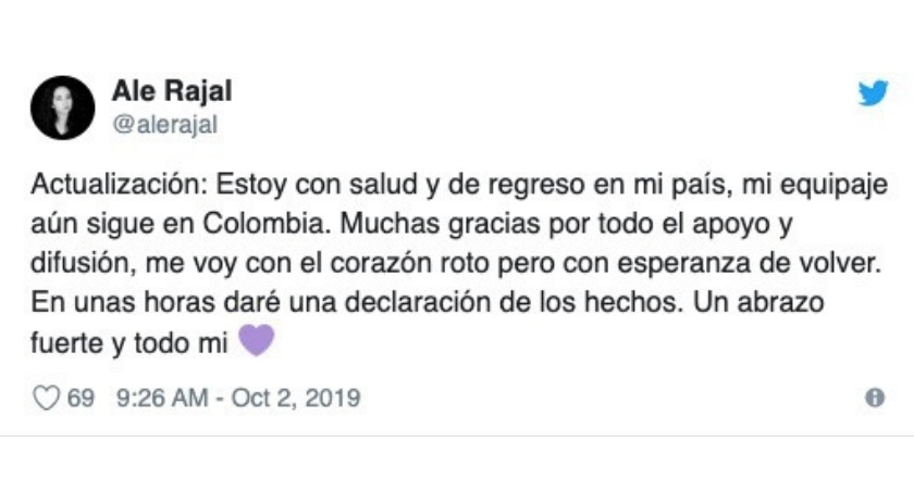 Por su parte, la mexicana señaló en esa misma red social que se encuentra “con salud y de regreso” en su país, aunque subrayó que el equipaje sigue en Colombia.