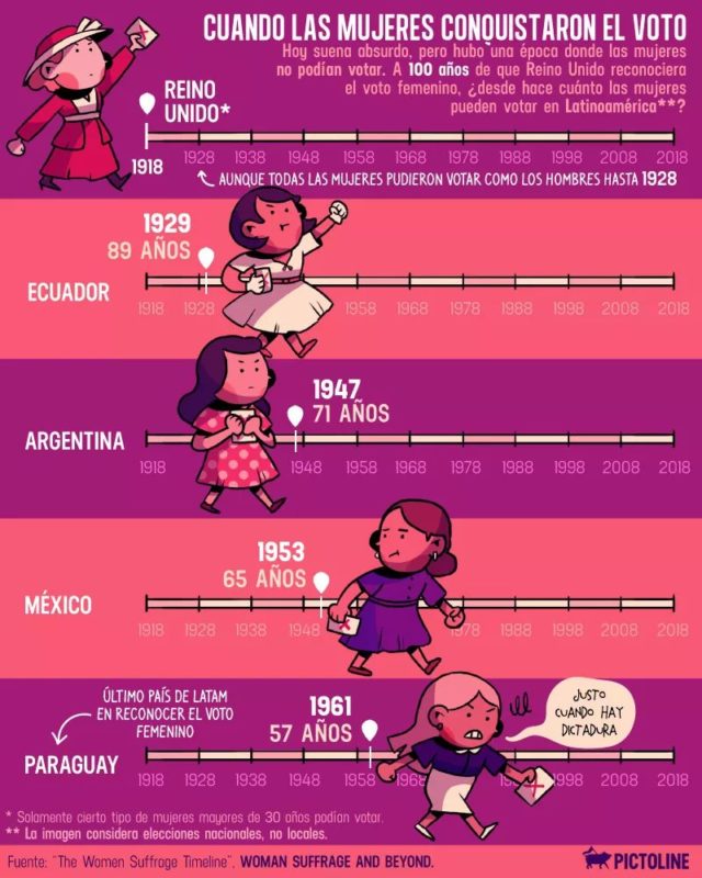 Derecho al voto febrero 7, 2018 1558 FacebookTwitterPinterestWhatsAppEmailPrintTelegram Anuncios Hoy suena absurdo, pero hubo una época donde las mujeres no podían votar. A 100 años de que Reino Unido reconociera el voto femenino, ¿hace cuánto lo logramos en Latinoamérica? Vía Pictoline. Anuncio Artículos relacionadosMás del autor UNFPA México presenta la serie Pulso Demográfico: Entendiendo las transformaciones de la población más allá de las cifras ¿Por qué las niñas adolescentes son clave para el desarrollo mundial? La respuesta en cinco gráficos Adiós a Díaz Ordaz y a López de Santa Anna: Ciudad de México arranca el plan para renombrar calles en honor a mujeres 414,247FansMe gusta0SeguidoresSeguir1,351SeguidoresSeguir