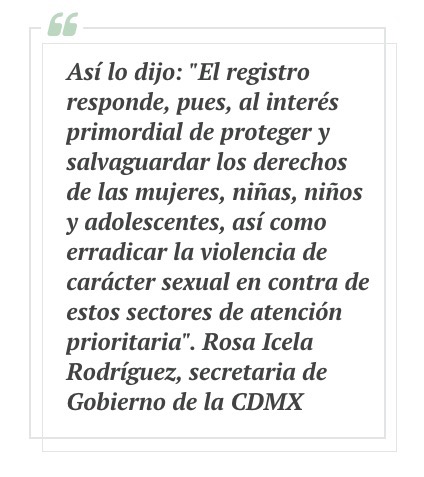 “Se establece aquí, en esta ley, la obligación del gobierno de la Ciudad de México, por conducto de la Secretaría de Gobierno, de organizar, elaborar, implementar, desarrollar, administrar, monitorear y mantener actualizado el registro de agresores sexuales, así como de evaluar su funcionamiento. El registro contendrá información de acceso público de las personas con sentencia firme, relacionada con delitos de carácter sexual, como la fotografía actual, el nombre, la edad, los alias, la nacionalidad y el delito o delitos sexuales, por lo que fue condenado mediante sentencia firme”, comentó.