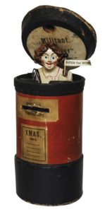 Se activaba mediante un mecanismo: al caer la moneda se abría la caja y aparecía una joven con una pancarta y un collar en pro del voto femenino. Diez años más tarde del primer voto de una mujer, en 1928, el sufragio femenino se extiende a todas las mujeres mayores de 21 años, en pie de igualdad con los hombres.
