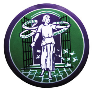 Esta famosa insignia fue diseñada por Sylvia Pankhurst. En ella vemos como una doncella sale de la cárcel vestida de blanco (símbolo de pureza), con los grilletes rotos a sus pies.