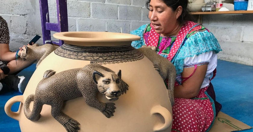 El día que conocí a Juana Ramírez, estaba sentada en el suelo sobre un cartón; vestía ropa tradicional y tenía frente a ella una olla de barro enorme con unos jaguares montados que parecen estar a punto de saltar para atacar; aquella vasija era un encargo desde el extranjero y su período de elaboración tardaría varias semanas.