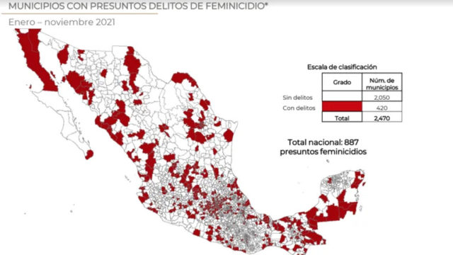Foto: (Secretariado ejecutivo del sistema nacional de seguridad pública)Por su parte, las estadísticas oficiales señalaron que, de los 2,420 municipios que hay en el territorio nacional, 420 tuvieron al menos un feminicidio en el año.