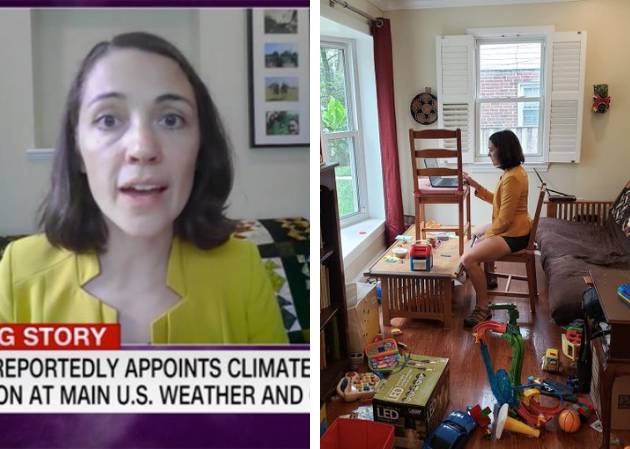 Vestida con un blazer amarillo, Gretchen Goldman daba su opinión a la cadena CNN desde el salón de su casa sobre la elección de David Legates, un negacionista del cambio climático, para liderar la Administración Nacional de los Océanos y la Atmósfera (NOAA, por sus siglas en inglés). Después de su intervención, la directora de Investigación del Centro para la Ciencia y la Democracia escribió en Twitter: “Solo para ser honesta. #DíaDeUnaMamáCientífica” y compartió una imagen de cómo es el lugar desde el que graba sus entrevistas.
