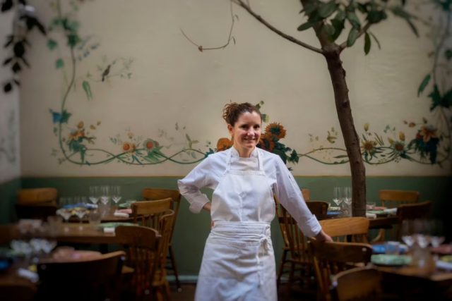 La chef mexicana Elena Reygadas, habla con el equipo del restaurante Rosetta en Ciudad de México.