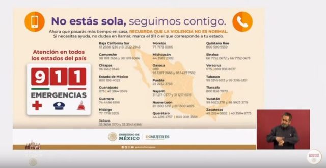 Nadine Gasman recalcó que la Jornada de Sana Distancia no es razón para aceptar ningún tipo de violencia y que los servicios de atención a la violencia contra las mujeres, así como el número de emergencia 911, siguen funcionando en todo el país las 24 horas.