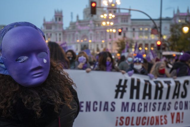 Elena de León Criado, presidenta de la Federación de Asociaciones de Mujeres de la Comunidad de Madrid, encabeza la manifestación y sujeta una pancarta que reza: “Hartas de las violencias machistas contra las mujeres. ¡Soluciones ya!”, el lema de la convocatoria. Desde la federación exigen que se incluya en la ley contra la violencia de género otras formas de violencia machista que tienen lugar en otros contextos que no son la pareja, “como la violencia sexual, la vicaria y la reproductiva, y también la prostitución”, para así alinearse con el Convenio de Estambul, tal como contempla la ratificación del Pacto de Estado contra la Violencia de Género que han firmado en el Congreso este jueves todos los grupos políticos menos Vox. Las manifestantes han coreado consignas como “sin putero no hay trata” o “mi vientre, mi vagina, ni se compran ni se alquilan”. Ambas hacen referencia a la futura ley de libertad sexual, conocida popularmente como la ley del solo sí es sí, que castigará la explotación de la prostitución ajena y categorizará como violencia machista los vientres de alquiler.