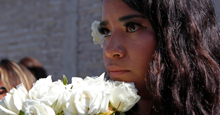 “¡Justicia para Samantha!” gritaban las activistas el domingo antes de colocar una pequeña imagen de una niña y el nombre de Samantha cerca de un mosaico con la imagen de Jesús en la cruz.