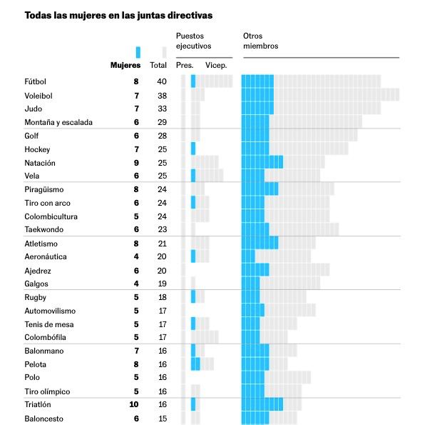 En España hay 65 federaciones deportivas. Sólo dos están presididas por mujeres: Asunción Loriente dirige la de Remo e Isabel García la de Salvamento y Socorrismo. El Consejo Superior de Deportes obliga desde 2014 a las federaciones a tener un porcentaje de representación femenina en sus juntas directivas u órgano similar para concurrir a las subvenciones ordinarias. Hasta 2018 el requisito era de tres mujeres o el 33%. Desde 2019, cuatro o el 40%. A partir de este año, el que quiera recibir subvenciones deberá contar con “como mínimo un 40% o cuatro mujeres en aquellas juntas con más de 10 personas, cinco para las de más de 15, seis para las de más de 20 o siete para las de más de 30″. Todas cumplen con la ley –sin eso no hay dinero- y presumen de ello; otra cosa es el papel que tienen las mujeres en los organigramas. Las hay vocales, en tareas de secretaría, recursos humanos, encargadas de las comisiones de deporte y mujer, pero en puestos de mando y responsabilidad apenas hay presencia femenina. De un total de 229 puestos ejecutivos sólo 32 los ocupan mujeres: el 14%.
