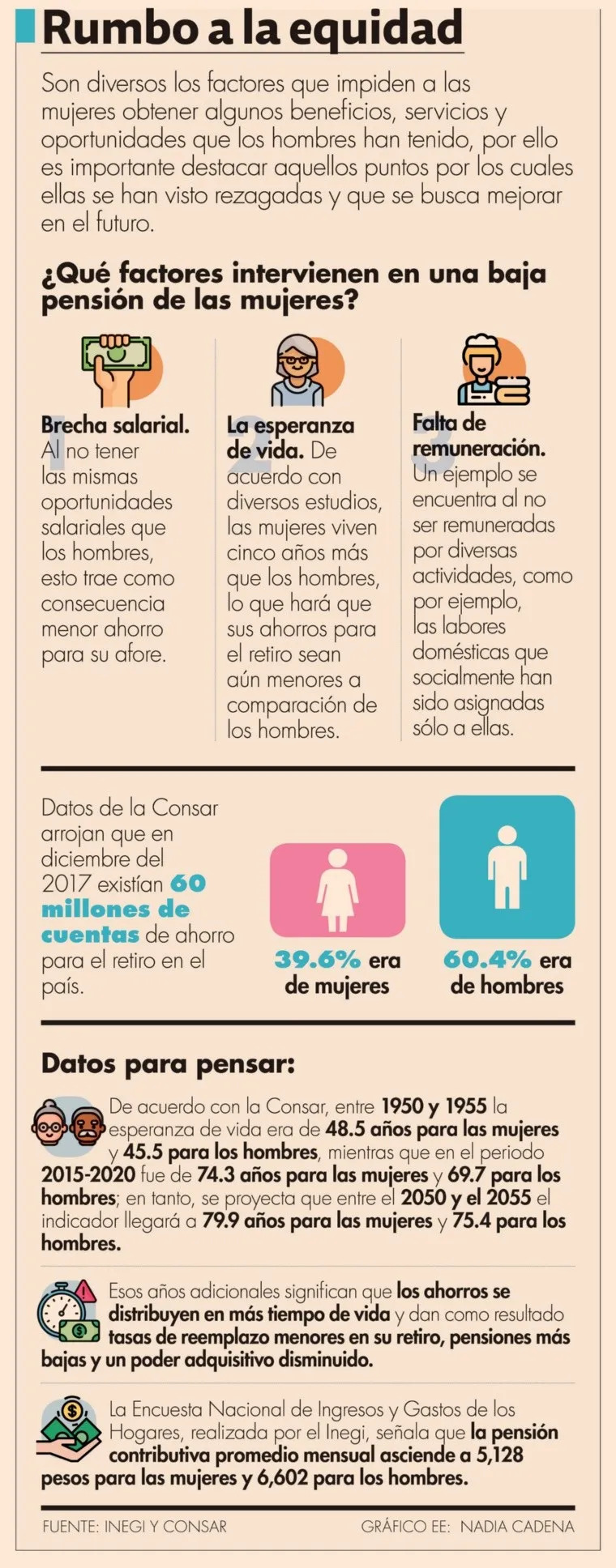 Eso no es todo, ya que al existir una mayor esperanza de vida para las mujeres, la Comisión Nacional del Sistema de Ahorro para el Retiro (Consar), añade que esos años adicionales significan que los ahorros se distribuyen en más tiempo de vida y dan como resultado tasas de reemplazo menores en su retiro, pensiones más bajas y un poder adquisitivo disminuido.