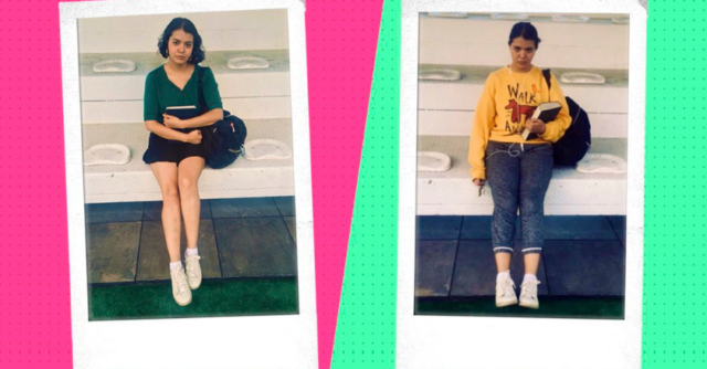 ‪Usé esa falda y esa blusa para estar en mi escuela la semana pasada. Los días estaban soleados y a mí me gusta mucho usar falda. Sin embargo, para poder ir de camino a la escuela y regresar, tuve que usar los pants y la sudadera sobre mi ropa. ¿Por qué tuve que hacerlo? Tenía miedo, creo que como todas.