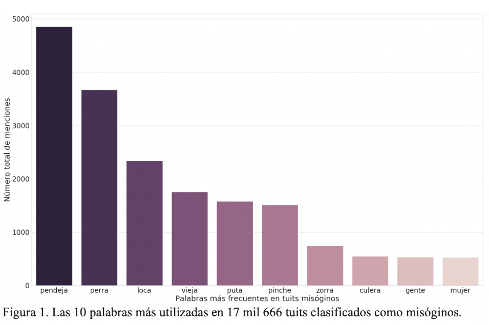 Figura 1. Las 10 palabras más utilizadas en 17 mil 666 tuits clasificados como misóginos.