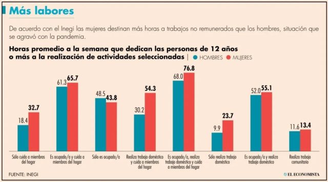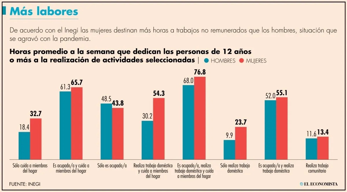 En este sentido, la ENIGH 2022 mostró que las mujeres que trabajan y al mismo tiempo se ocupan de alguien y de los cuidados del hogar dedican 76.8 horas a la semana a ello, contra las 70.7 horas que dedican los hombres.