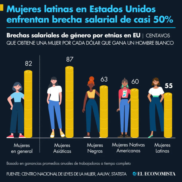 La brecha de género es un problema persistente alrededor del mundo: las mujeres reciben menor paga por el mismo trabajo. En Estados Unidos esta situación se profundiza con otras condiciones raciales o étnicas; por cada dólar que gana un hombre blanco, su par mujer latina gana sólo 55 centavos de dólar.