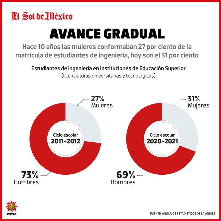 De los más de 924 mil estudiantes inscritos en las carreras de ingeniería de las universidades del país, apenas 291 mil son mujeres, revelan datos del anuario estadístico de la Asociación Nacional de Universidades e Instituciones de Educación Superior (ANUIES) correspondiente al ciclo escolar 2020-2021. Esto significa un 31 por ciento.