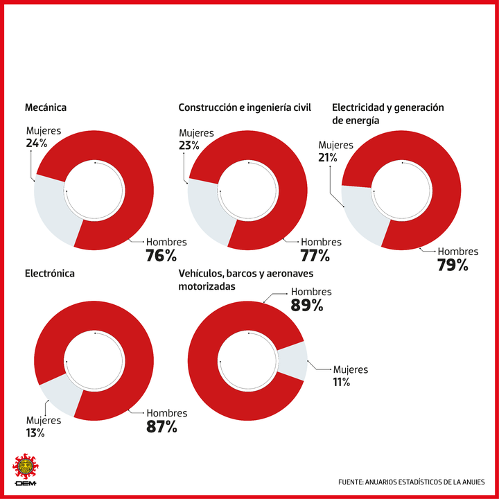 Al contrario, son muy minoritarias en ingenierías relacionadas con la construcción de vehículos, barcos y aeronaves motorizadas (11 por ciento), la electrónica (13 por ciento), la eléctrica (21 por ciento), la civil (23 por ciento) y la mecánica (24 por ciento), indican datos de la ANUIES.