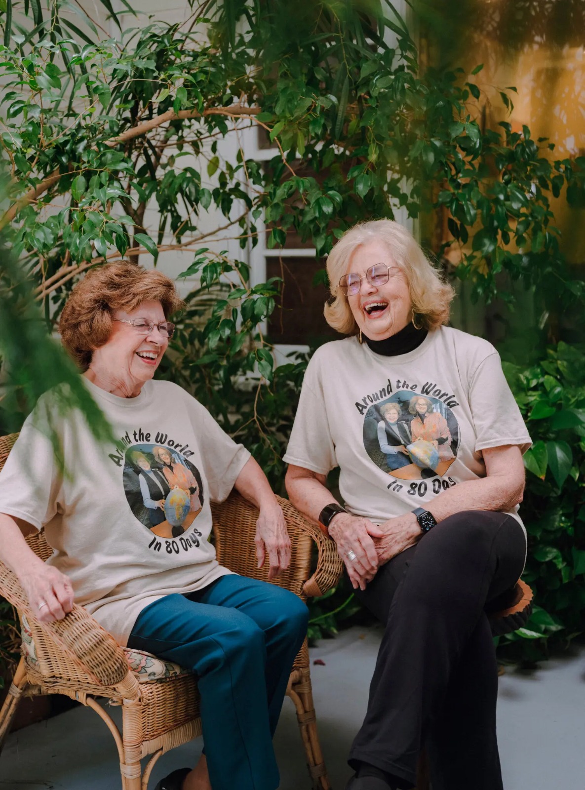 The two women, wearing matching T-shirts about their “Around the World’ trip, have their arms wrapped around each other as they smile.