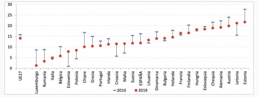 Gráfico.- Brecha salarial de género en los países de la UE-27, en 2010 y 2019 (en %)