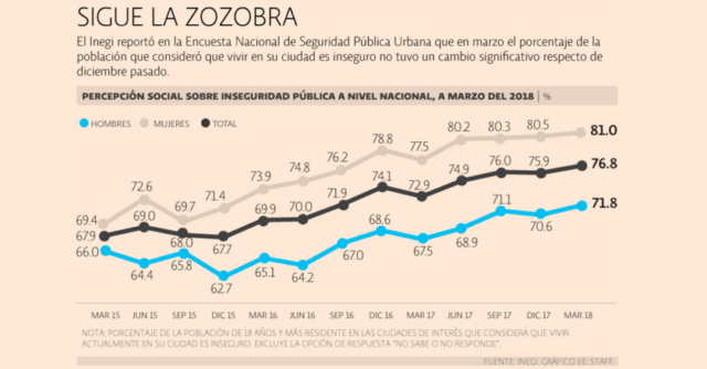 Este sondeo, hecho durante marzo del año en curso, reveló que 76.8% de la población de 18 años y más consideró que vivir en su ciudad no es seguro. Esta percepción es mayor en el caso de las mujeres con 81.0%, mientras que para los hombres fue de 71.8 por ciento.