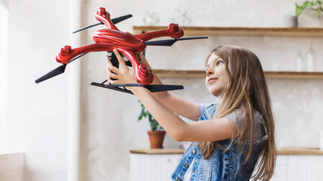 Young cute girl exploring quadcopter. Education, future, children, technology, science and modern people concept